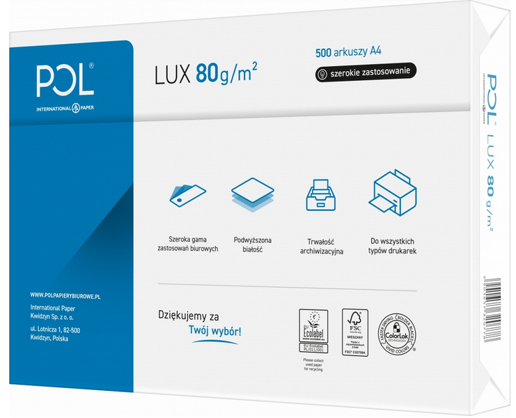 Papier do kopiowania/drukowania Pollux A4 Białość 161CIE !!! KLASA B !!! Papier ksero przeznaczony do zastosowań biurowych do wydruków na urządzeniach laserowych jak i atramentowych - format: A4 - gramatura: 80 g/m2 - 1 ryza = 500 arkuszy.